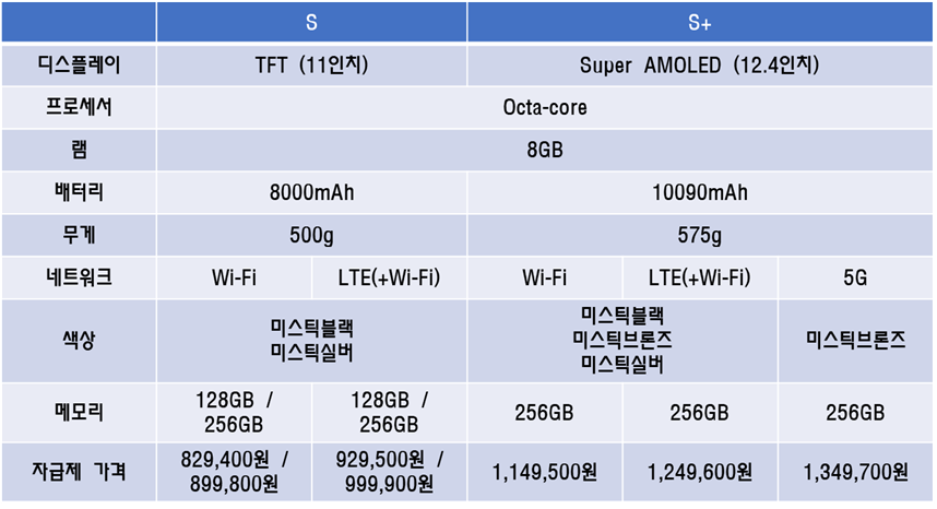 탭 S 시리즈는 화면 크기에따라 S와 S+ 로 구분되며, 무선네트워크를 Wifi, LTE, 5G 까지 지원함에 따라 별도 사양으로 판매되는데,